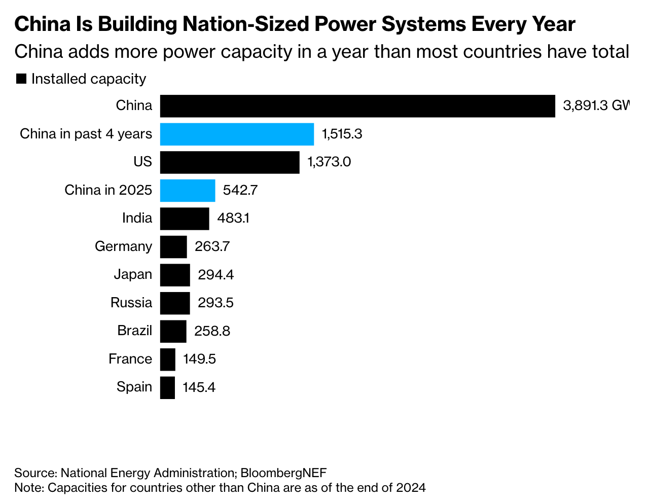 Breathtaking bar charts like this don’t come very often. Chinese electrical capacity added in the last four years exceeds the entire installed base of the United States. Most of the new installations are wind and solar, but there were significant additions of thermal coal plants, too. Mostly, it’s a country that doesn’t want to be caught short for the coming boom in AI, robotics and advanced manufacturing.
